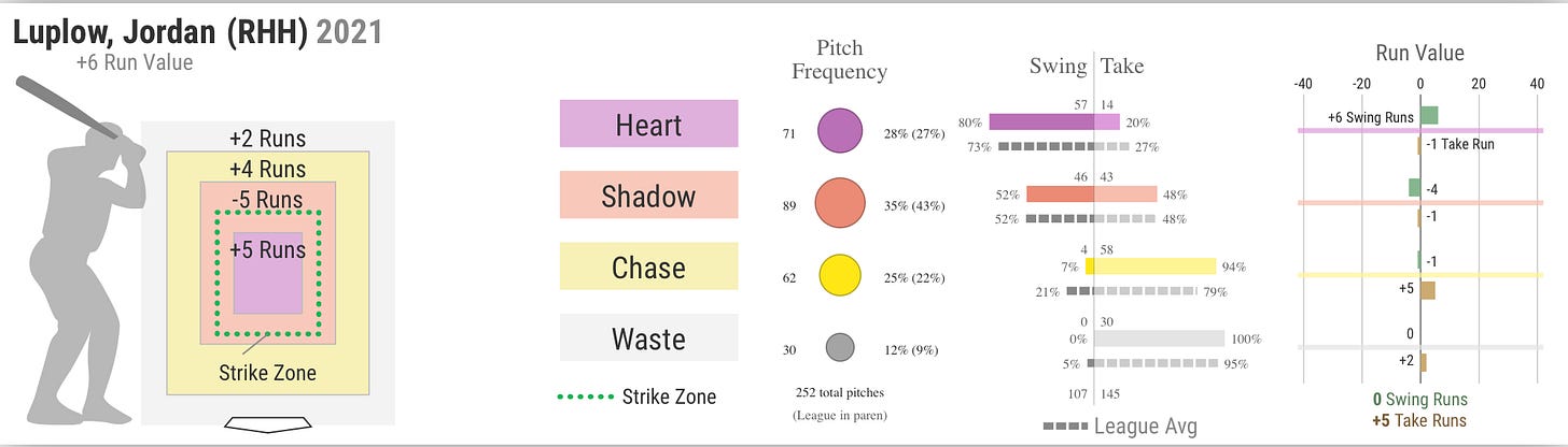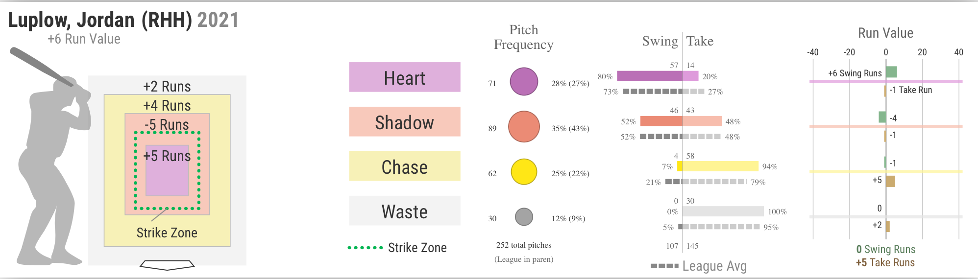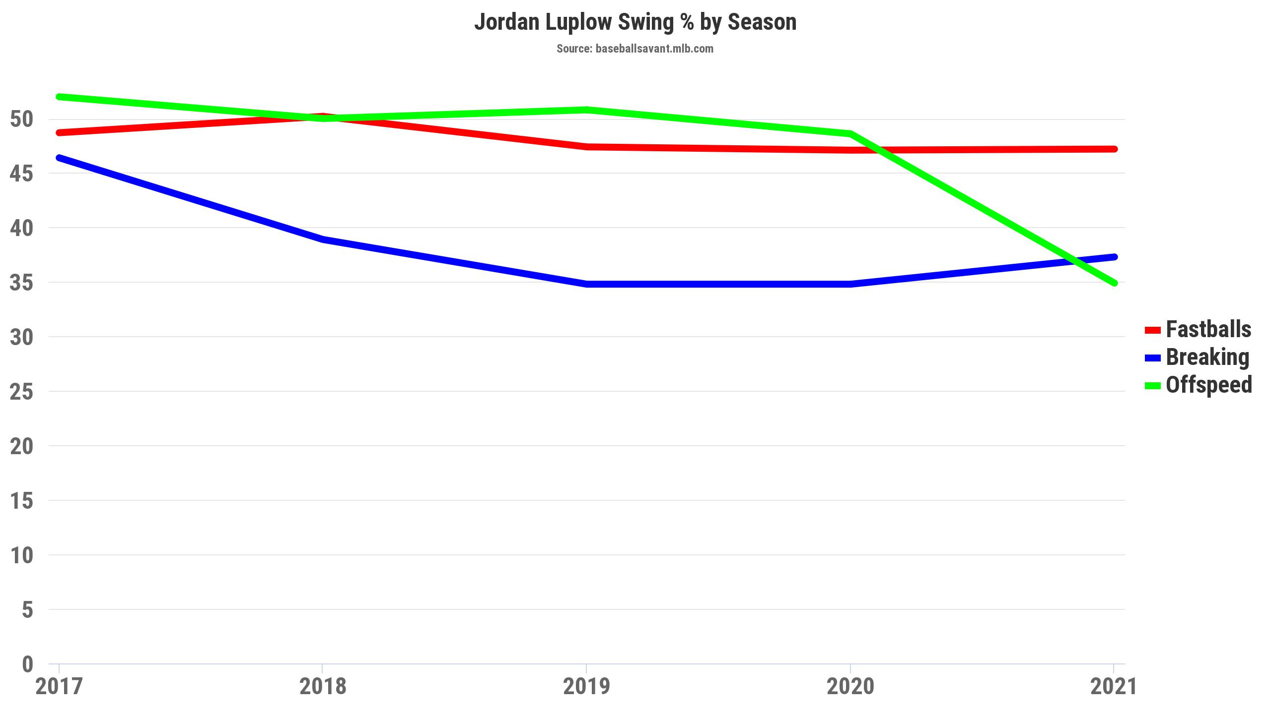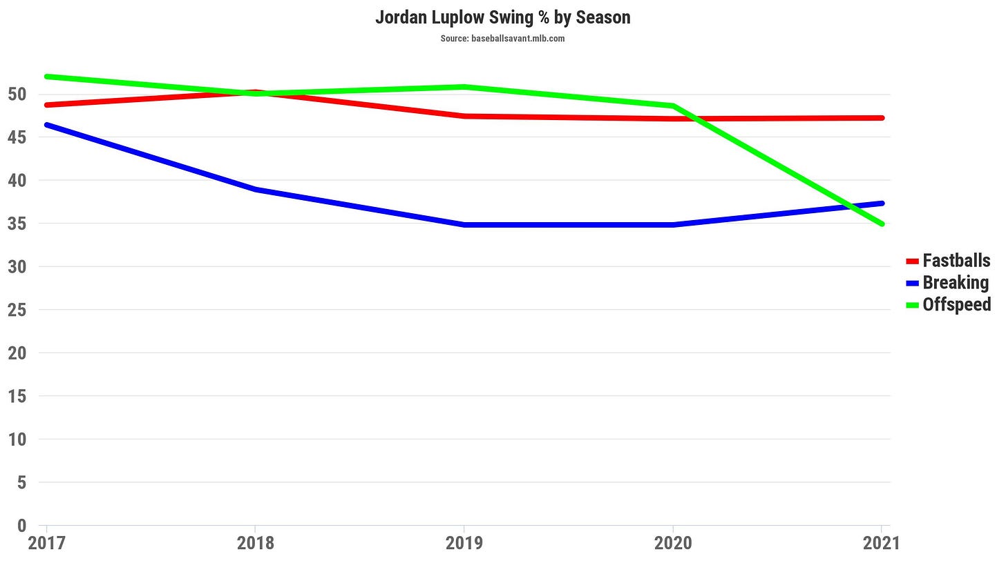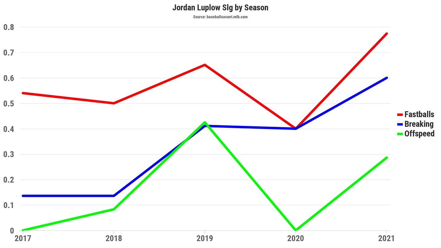 To Luplow’s credit, he’s done a better job of hunting the right pitches and avoiding the ones in which he struggles. Throughout his career, he’s had better luck driving “fastballs” and “breaking” pitches than offspeed (changeups).